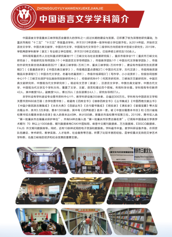 接教育部、国务院学位委员会通知,重庆三峡学院中国语言文学一级学科硕士学位授权点于2020年9月通过复评验收,将于2021年恢复招生。本学位授权点经过进一步建设和发展,学科优势明显、学科特色鲜明,学科连续获评重庆市“十二五”、“十三五”重点学科。本学位授权点学科方向增至5个,包括:文艺学、汉语言文字学、中国古典文献学、中国古代文学、中国现当代文学。热忱欢迎有志于学术和进一步深造的海内外学子报考和加盟!