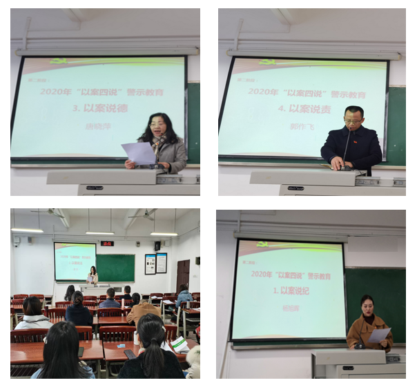 会上,全体党员教师观看了近年来重庆市不同领域的违法违纪案例警示教育片。随后,党总支纪检委员杨旭晖,党总支副书记姜希,党总支书记唐晓萍,党总支副书记、院长郭作飞分别从“纪、法、德、责”等方面警示大家以案为训、以案为戒,事事以纪律“警戒线”自律,处处以法律“高压线”自警,时时以道德“生命线”自省,以“初心和使命”擦亮政治底色,扎实抓好“以案四说”,持续推进“以案四改”,进一步筑牢拒腐防变的思想防线。