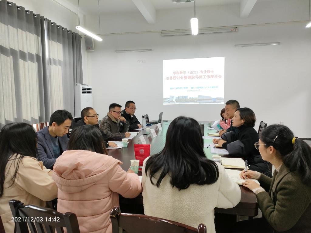12月3日下午,我院学科教学(语文)专业硕士培养研讨会暨兼职导师工作座谈会在博学楼3栋409顺利举行。来自重庆文理学院的兼职导师王长武副院长,傅钱余、胡牧,窦新光博士,以及我院副院长李俊、向学春,导师马婷等共13人等参加座谈。会议由向学春主持。