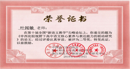 12月23日晚,浙江师范大学公布了在“第十届全国‘新语文教学’尖峰论坛”研讨会上提交论文的获奖名单,我院语文教育专业硕士研究生叶闻敏提交的题为《中西比较视野下高中语文核心素养与表达能力联动研究》的论文荣获二等奖。