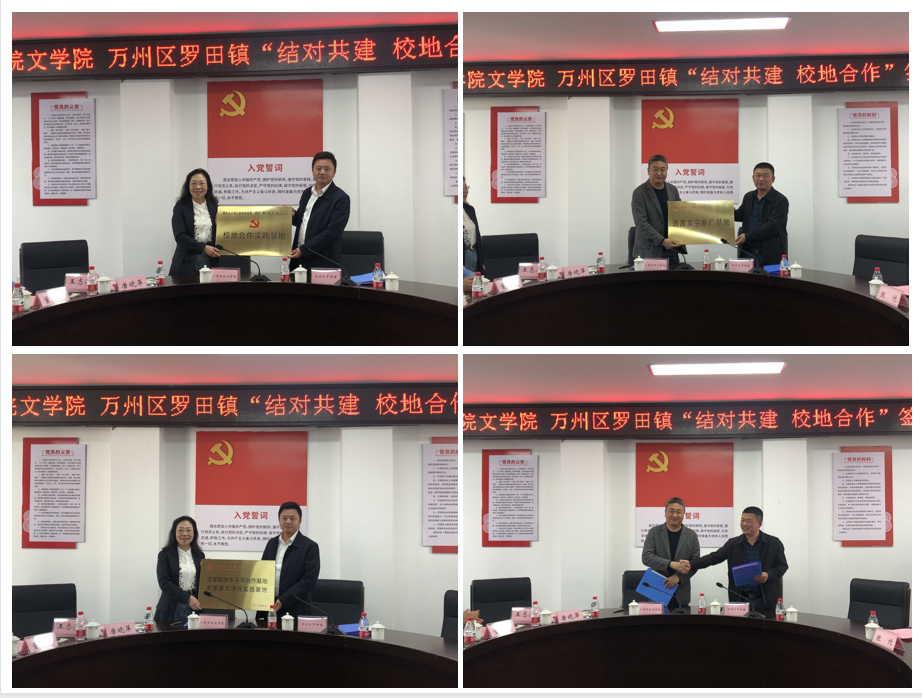 为深化校地合作,5月11日,我院基层党组织结对共建校地合作实践基地、学生采风创作(大学语文课程实践)基地、语言文字推广基地签约授牌仪式在万州区罗田镇政府会议室顺利举行。罗田镇党委书记邵太清、镇长魏大东、人大主席余先莉等出席签约仪式,我院党总支书记唐晓萍、院长李俊、党政办公室主任杨旭晖、学工办主任张悦、大学语文教研部主任董运生及部分学生代表参加签约,我校三峡研究院院长王志清、工商管理学院副院长周学军陪同出席,签约仪式由邵太清主持。