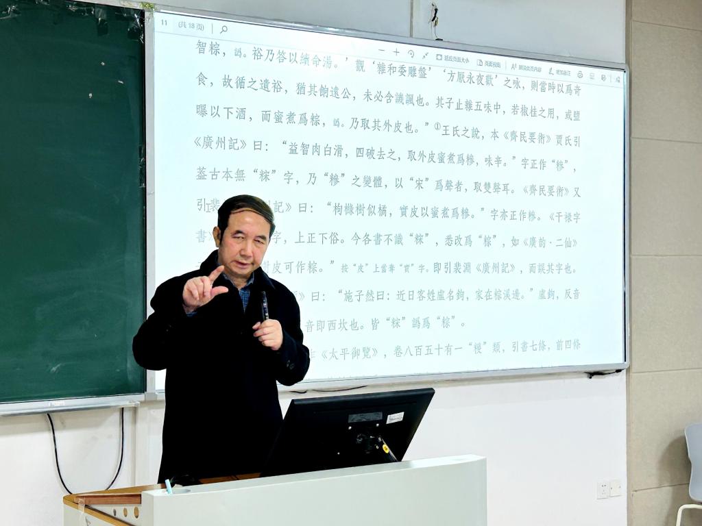 首先,蒋宗福以千百年来有许多字词误传至今为切入点引出本次讲座主旨:《宋书》《魏书》《南史》《资治通鉴》等典籍和语文辞书收录的“鬼目粽”“益智粽”“益智糉”之“粽”或“糉”,应作“䊉”,义为“蜜渍瓜果或蜜饯”。接着,他结合大量文献用例阐述了“䊉”的含义以及被谬传作“粽”的来龙去脉。然后,他从典籍中寻找依据,层层深入地论证了“粽”和“䊉”的音义差异,并对典籍“䊉”形讹作“粽”或“糉”的原因进行了详细讲解。最后他指出:今辞书据误本收录错误条目,甚至望文生训,谓“益智粽”为益智拌米、与米混合或益智之实加蜜做成的粽子,殊为不经,应予改正。蒋宗福广博的知识储备与独特的研究视角引发了在场师生深深的思考和热烈的讨论,大家纷纷表示受益匪浅。