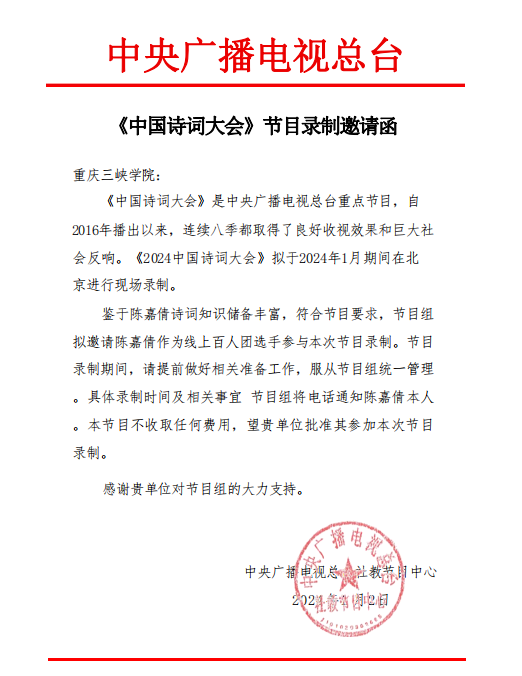 近日,bw必威西汉姆联官网传来喜讯,2021级汉语言文学(师范)4班的陈嘉倩同学成功入选《2024中国诗词大会》线上百人团。“中国诗词大会”是一档由中央广播电视总台原创的大型文化节目,节目以“赏诗词之美、寻文化之根、铸民族之魂”为理念,唤起人民群众对传统诗词文化的浓厚兴趣,在全国范围内掀起了广大诗词爱好者学习的热潮。