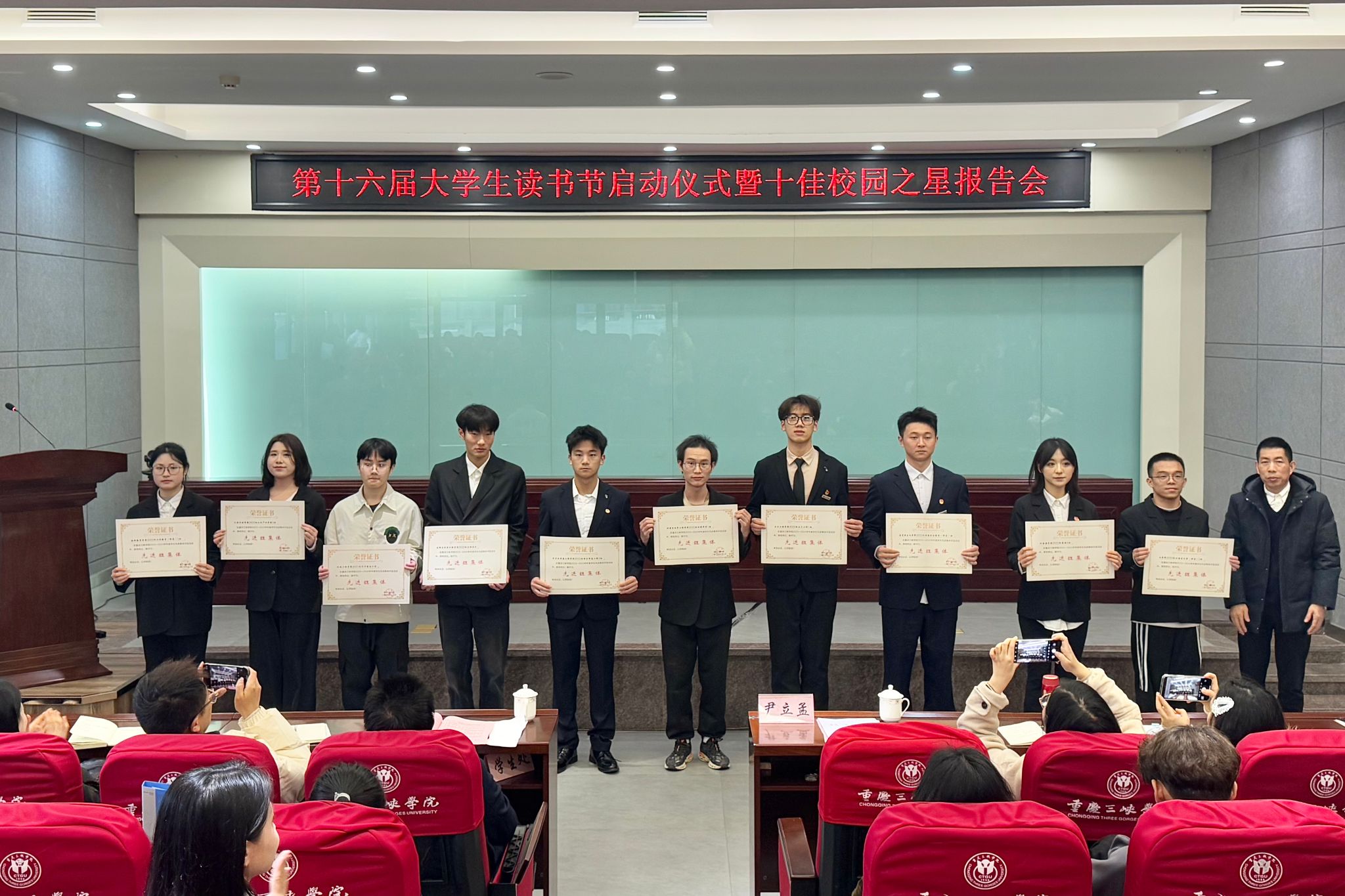 学生处副处长代小菊宣读学校关于2023-2024学年度学生先进集体和先进个人的表彰文件,对在学术科研、志愿服务、创新创业等领域表现突出的学子予以表彰。尹立孟为各类获奖代表颁奖并合影留念。