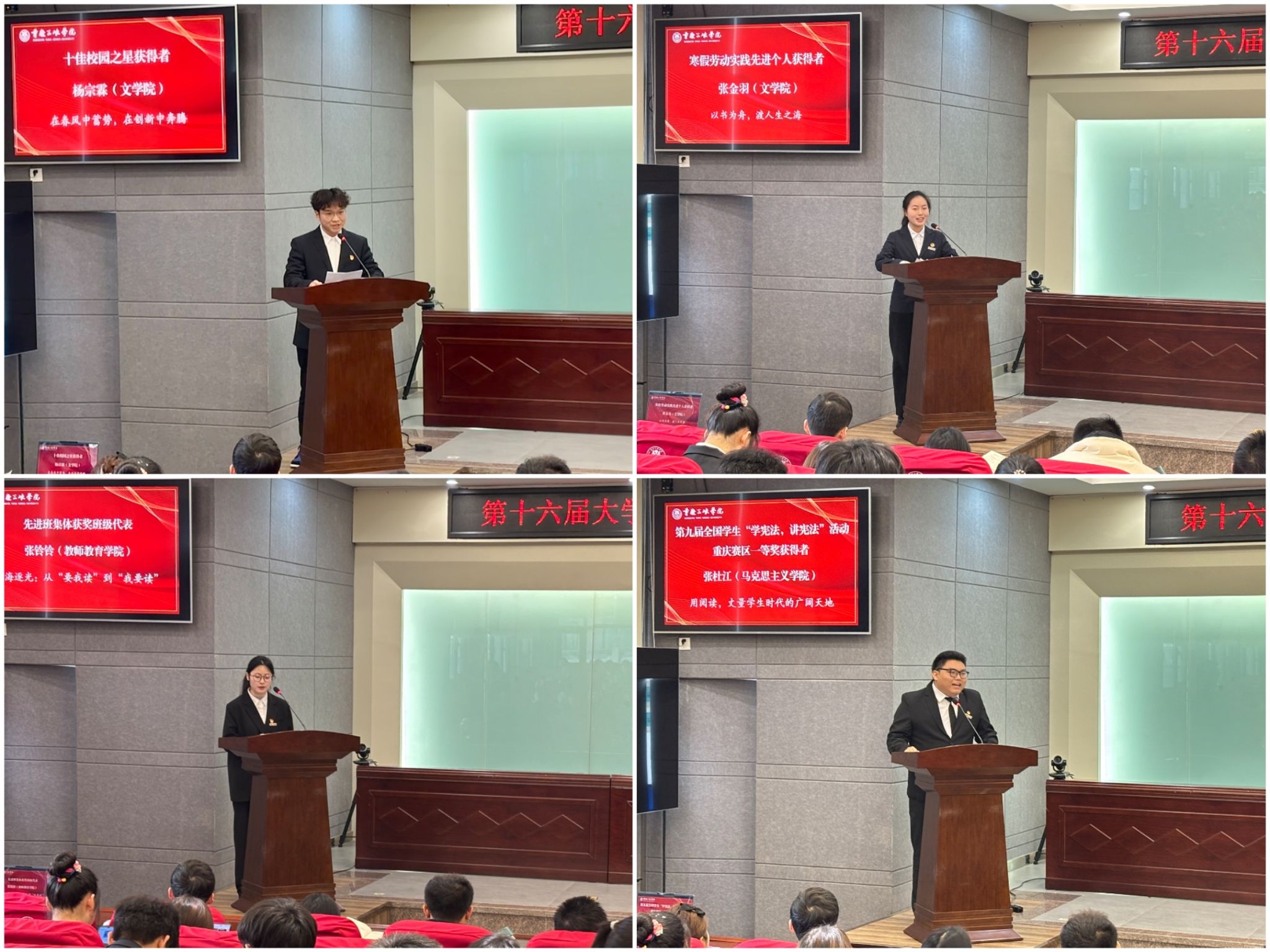 张杜江、阳艺、潘存喜、杨宗霖、唐道敏、陈娟、张铃铃、张金羽逐一发言,作先进事迹报告,分享他们在学业、科研、社会实践等方面的奋斗故事与宝贵经验,展现出了莘莘学子积极进取、昂扬向上的青春风采与责任担当。