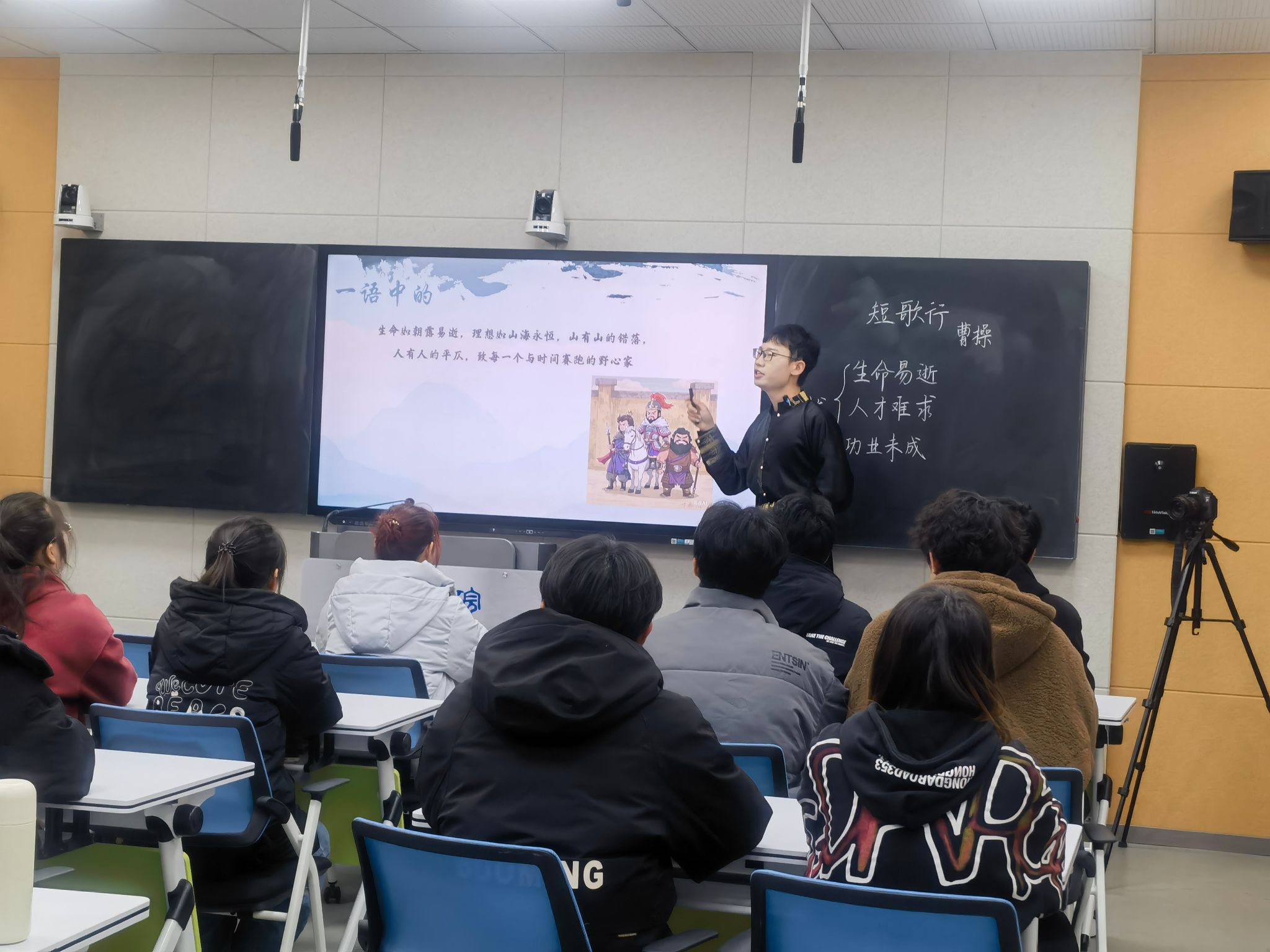 本次选拔赛分为初赛、复赛和决赛三个阶段。初赛中,60名参赛学生各展风采,他们以饱满的热情、扎实的功底,对经典诗词进行了精彩的讲解。经过评委们的认真评审,筛选出部分优秀学生晋级复赛。复赛阶段,竞争愈发激烈,选手们在诗词讲解中融入了更深入的理解和独特的见解,从诗词的创作背景、文学价值到情感内涵,都进行了细致入微的剖析,展现出了较高的专业水平和文学素养。最终,22级卓越班工作坊的张家豪同学凭借对《闻王昌龄左迁龙标遥有此寄》的“迢迢念君心,明月遥相寄”的精彩讲解,赢得了评委们的一致认可。他深入解读了李白在诗中所表达的对友人的关切与思念之情。23级卓越班工作坊的文翔同学在讲解《短歌行》时,以“因声求气,共读佳”的独特视角分析了曹操诗歌中的慷慨与智慧,以及激昂与求贤若渴的情怀,其扎实的知识储备和出色的表达能力,给评委和观众留下了深刻的印象。