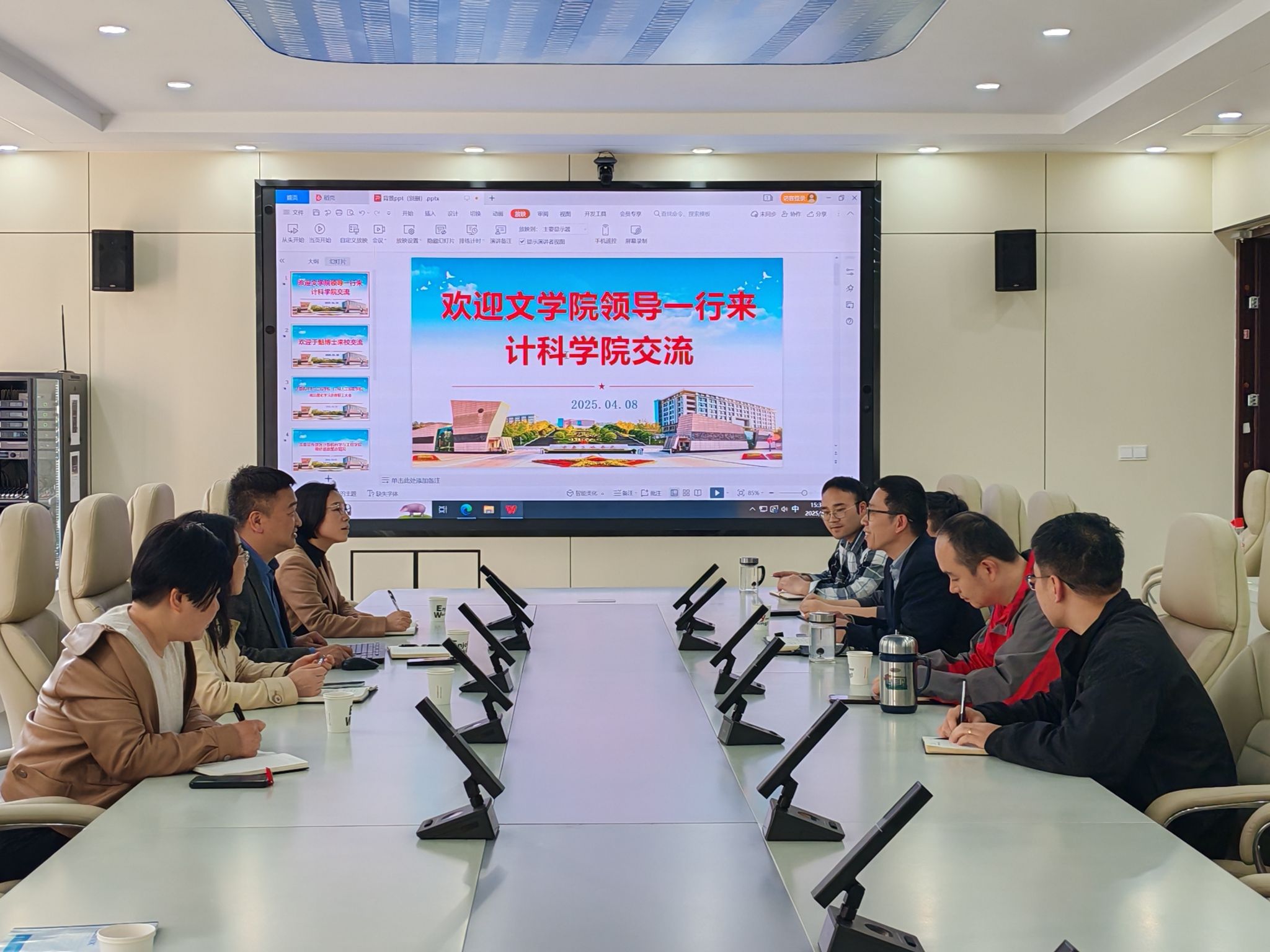 为深入贯彻“文理交叉,文工融合”新文科建设理念,推动学院学科、专业的数智化转型,加快我院获批的重庆市首批文科重点实验室——三峡人文数字化实验室、重庆市首批产教融合特色优势专业群——三峡文化创意产业专业群的建设步伐,2025年4月8日下午,学院党政班子一行到计算机科学与工程学院开展合作交流,计算机科学与工程学院党政班子及教师代表参加了此次交流活动。