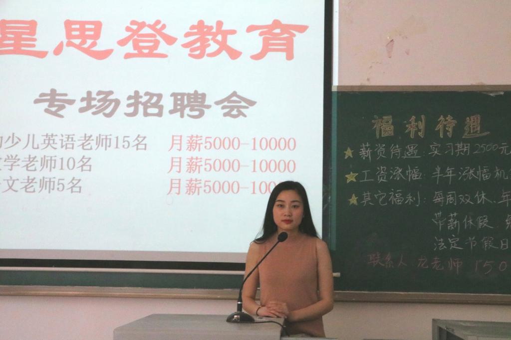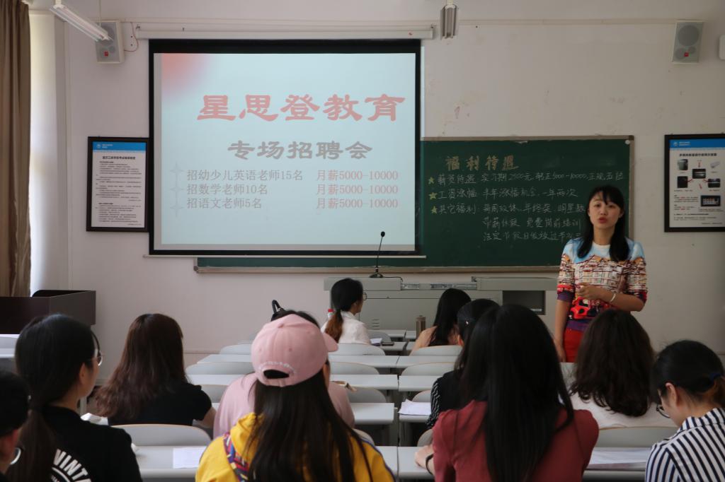 4月19日下午2:30,我院于三教102举办了星思登专场招聘宣讲会。本次活动由星思登教育机构创始人、我校2012级毕业生谭燕主讲,我院大四部分学生参加。