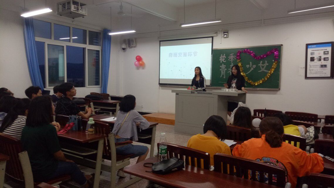 近年来,随着我国高等教育的进一步改革和发展,女大学生的健康成长状况逐渐受到社会各界的广泛关注。为传递校园正能量,鼓励学生们自尊、自爱、自强,加强学生对时间的重视和利用,我院于4月23日晚上7点在大一各班教室举办了“花样青春少女”主题班会。