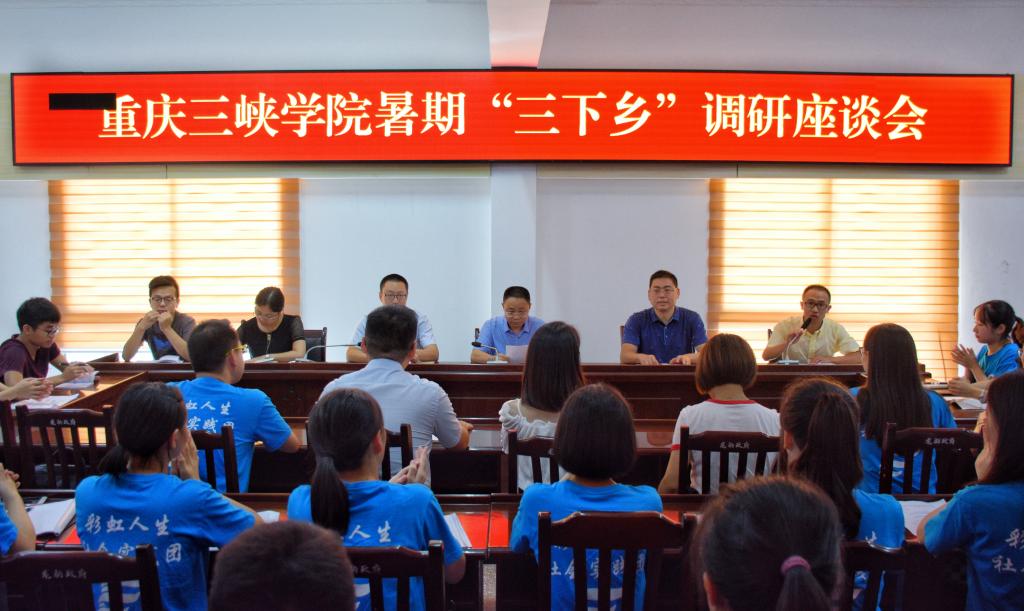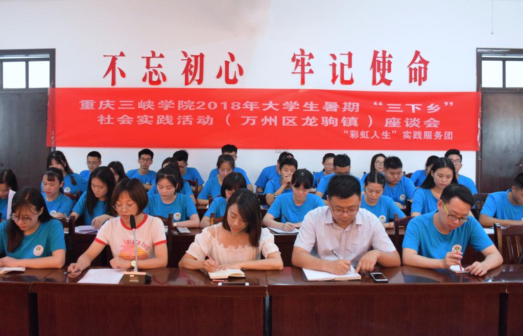 由重庆三峡学院财经学院、bw必威西汉姆联官网、马克思主义学院联合组建的“彩虹人生”实践服务团于7月9日前往重庆市万州区龙驹镇,开展2018年大学生暑期“三下乡”社会实践活动。当日上午,龙驹镇党委组织召开见面座谈会。龙驹镇党委书记张凤政、党委副书记郭代伯,重庆三峡学院马克思主义学院党总支常务副书记秦勤、bw必威西汉姆联官网党总支副书记姜希、财经学院党总支副书记骆孟鑫出席会议,龙驹镇党办、团委负责人及实践服务团全体成员参加座谈。座谈会由龙驹镇人大副主席、团委书记汪金欢同志主持。