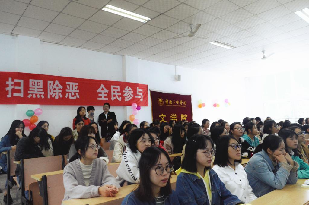 为拉起全面扫黑除恶的旗帜,让大家更深入地了解扫黑除恶知识,10月19日,我院18级汉文一、二班于明辨楼2栋101联合举办了“扫黑除恶,全民参与”团日活动,我院团总支组织部、18级汉语言文学一、二班以及17级汉文一班全体同学参与本次活动。
