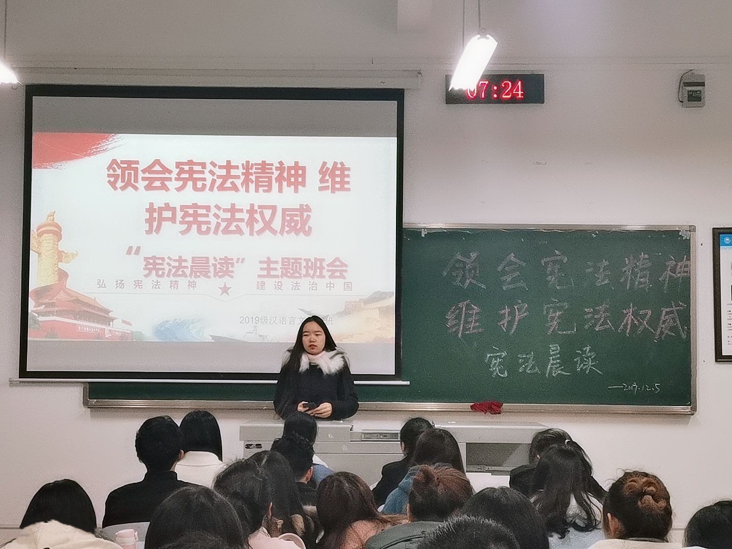 为了贯彻落实新时代法治精神,营造学宪法、懂宪法的良好社会风尚,进一步引导大学生树立法治观念,增强学生宪法意识,做遵纪守法的当代大学生。12月5日上午,bw必威西汉姆联官网2019级辅导员阮碧波组织各班开展了“领会宪法精神,维护宪法权威”宪法晨读活动。