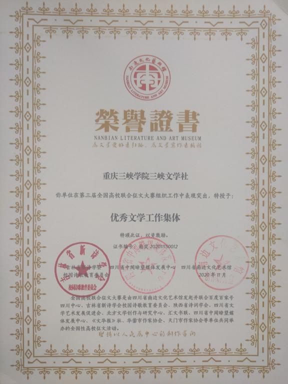 在第三届全国高校联合征文大赛中,三峡文学社申请成为协办单位,积极组织征文工作,我院学生踊跃参加,共投稿346篇。