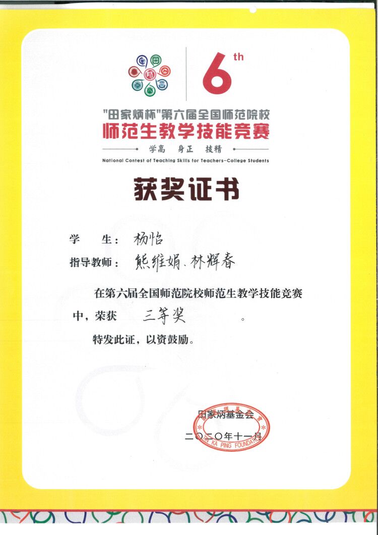 11月20日,“田家炳杯”第六届全国师范院校师范生教学技能竞赛圆满完成,我院2018级汉语言文学(师范)专业杨怡同学荣获三等奖。