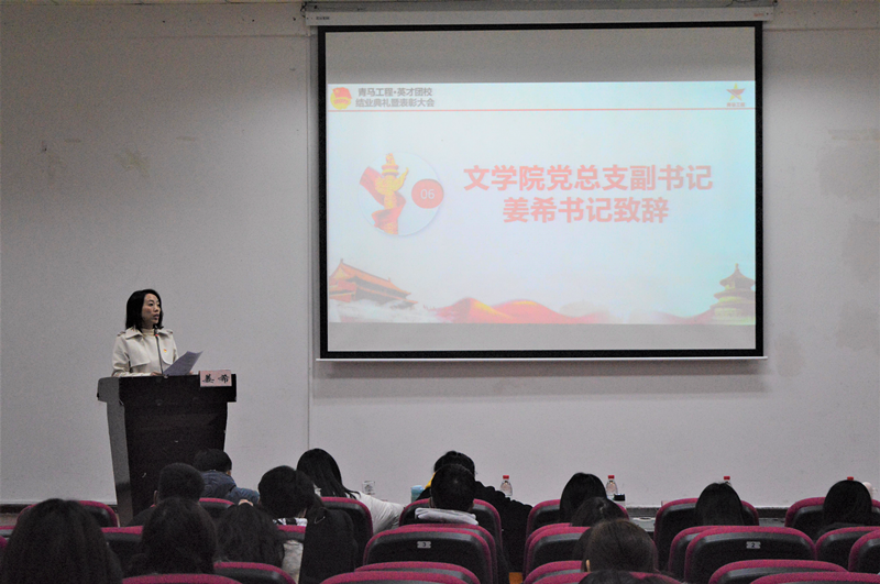 最后,我院党总支副书记姜希做总结发言。她对本次典礼给予了肯定,她谈到:“学员们应该深入学习贯彻十九届五中全会精神、习近平新时代中国特色社会主义理论,回顾中国共产党的历史,了解共青团的历程,提高自身理论水平并且在今后的学习中应当继续努力,充分利用各种学习机会,不断完善提高自己,将自己培养成德智体美劳全面发展的新时代青年和社会主义接班人。”