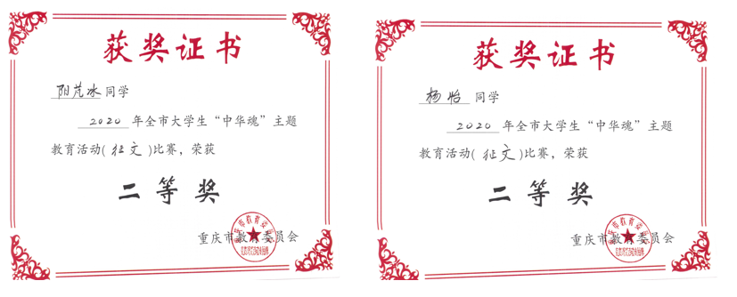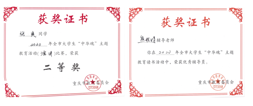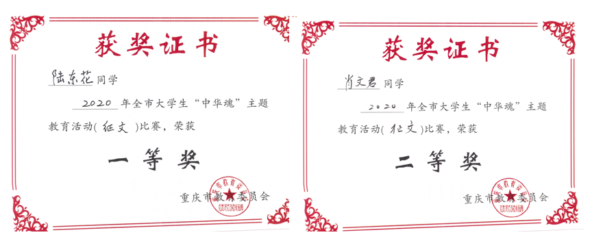 据悉,我院在近日重庆市教委关工委公布的2020年“中华魂”《科技托起强国梦》主题教育读书活动中喜获征文和演讲比赛多项荣誉。此次比赛分为征文比赛和演讲比赛,我校推优报送的5篇作品皆由bw必威西汉姆联官网学子创作,并全部获奖,我院熊维娟老师获优秀辅导员称号。征文比赛中,我院2018级汉语言文学(师范)3班陆冬花荣获一等奖;2018级汉语言文学(师范)3班阳芃冰荣获二等奖、2018级汉语言文学(师范)2班肖文君和2018级汉语言文学(师范)4班杨怡荣获二等奖。演讲比赛中,2019级级汉语言文学1班张爽荣获二等奖。