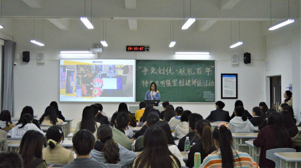 为充分发挥学生宿舍集体在学生成长中的凝聚作用,形成和谐的校园氛围,4月24日晚,我院于博学楼一栋105室举办“争先创优•献礼百年”特色文明寝室创建评比活动。