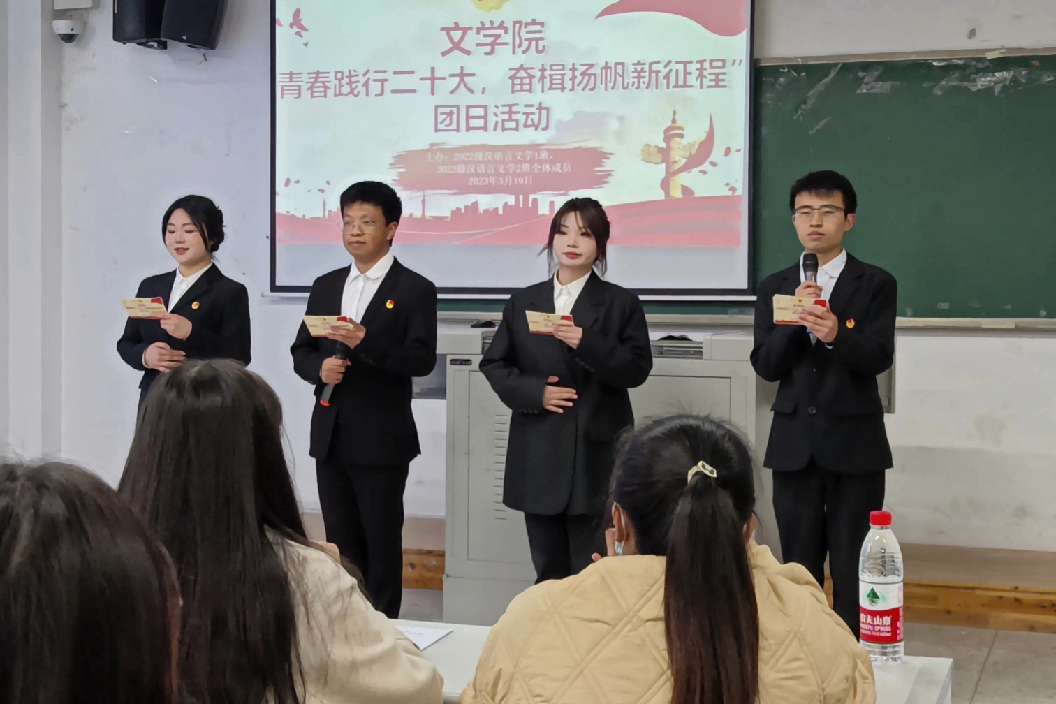 为继续深入学习贯彻党的二十大精神,提高青年团员的思想政治水平。bw必威西汉姆联官网于2023年3月19日下午2:30在明辨楼1栋204成功举行了bw必威西汉姆联官网“青春践行二十大,奋楫扬帆新征程”的主题团日活动。2022级汉语言文学专业全体同学参加此次活动。