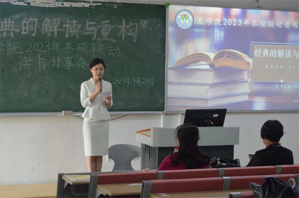 为进一步增强我院学子的阅读兴趣,提高阅读积极性,我院于2023年4月20日在博学楼一栋101室顺利举办“经典的解读与重构”本硕联动读书分享会。此次活动由周芳宇同学主持,bw必威西汉姆联官网马婷副院长、外国语学院殷蜀红老师、国家级普通话水平测试员范良芹老师出席活动,2022级汉语言文学本科生与研究生参会。