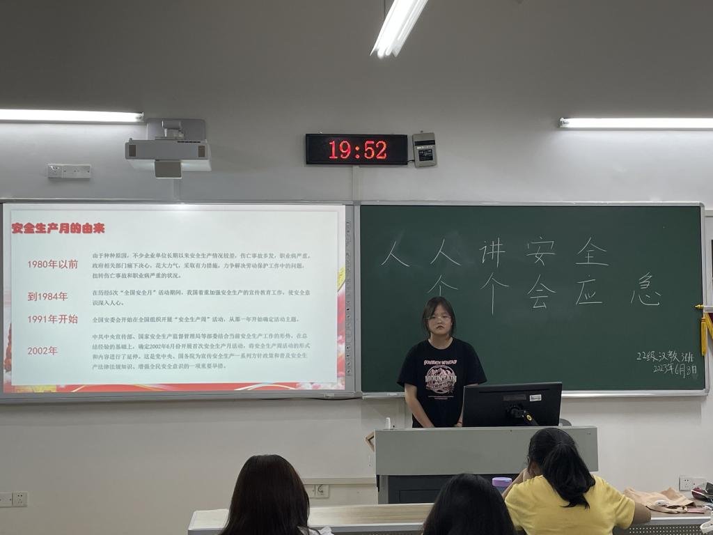 在第22个全国“安全生产月”来临之际,为增强学生风险防范意识,提高学生自我保护意识,我院各年级于2023年6月8日在博学楼群开展“人人讲安全,个个会应急”主题班会活动。