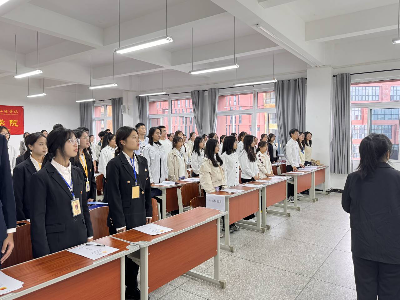 会议第一项,由主持人宣布大会开幕,全体代表起立齐唱国歌。