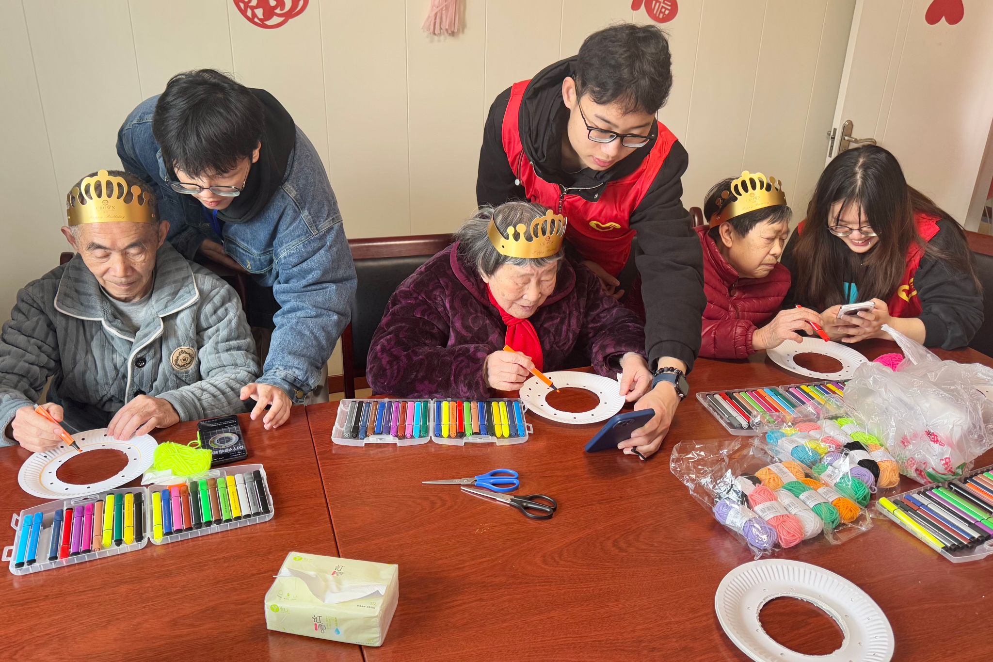 活动伊始,一场温馨的生日会拉开序幕。志愿者为当月生日的老人戴上生日帽,大家围坐在一起,共同唱响生日快乐歌。摇曳的烛光映照着老人们幸福的面庞,他们许下心愿,随后与志愿者一同分享蛋糕。现场还特别设置心愿墙,老人们在贴纸上写下心愿,志愿者将承载美好憧憬的贴纸贴在墙上。随后,创意手工制作环节欢乐开启。志愿者与老人们携手制作捕梦网,志愿者们耐心为老人递上材料,并在一旁协助制作。在大家的共同努力下,一个个精美的捕梦网逐渐成型,它们不仅凝聚着老人们对美好生活的期许,更象征着志愿者与老人间深厚的情谊。活动最后,志愿者们分组走进老人房间,耐心倾听老人们讲述过去的故事。志愿者们用真诚的陪伴,让老人们感受到家的温暖。