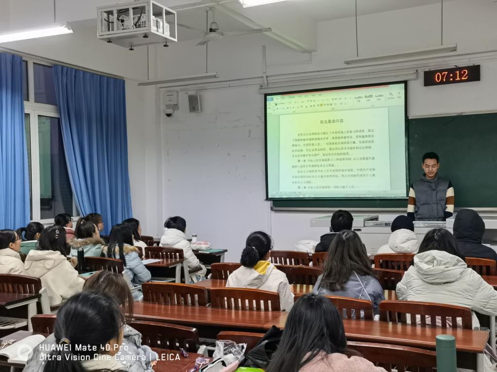 2020年12月4日是第七个国家宪法日。为进一步弘扬宪法精神,增加同学们的法治意识,12月4日,我院2020级各班组织全体同学利用早自习诵读宪法部分内容。同学们在诵读过程中认真、严肃,通过诵读深入学习了宪法精神,提高了同学们对法律的认知,增强了同学们对法律的敬畏之心。