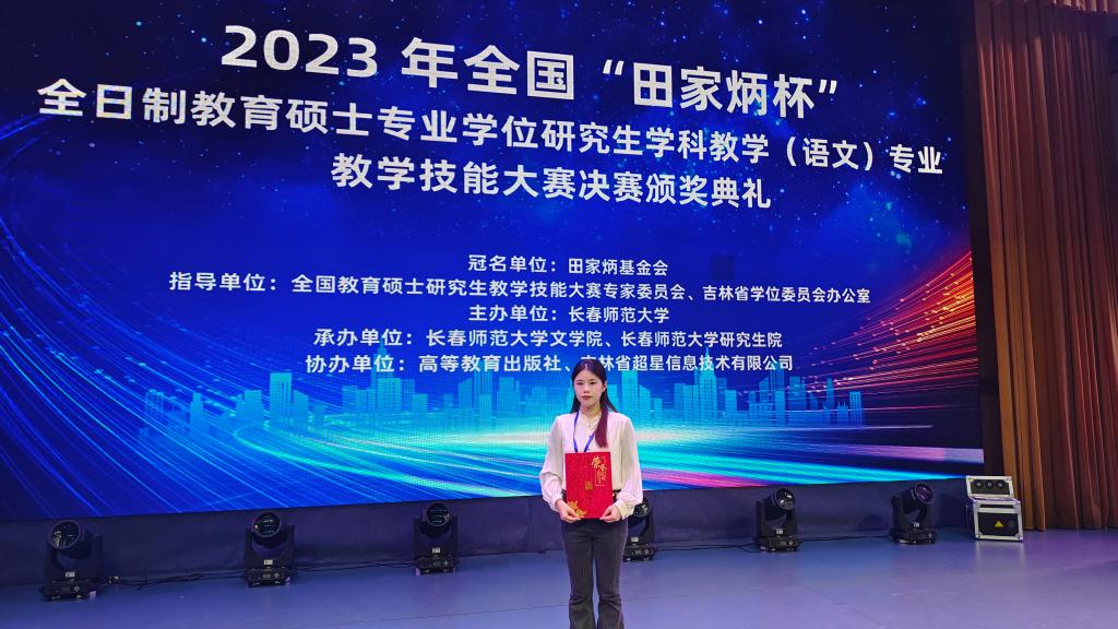 操千曲而后晓声,观千剑而后识器。学习学科教学(语文)专业的她深知只有不断磨练师范技能,才能打牢教育教学的基础。于是便日复一日地熟悉中学教材,解读语文课标,精心打磨教案,学习前辈经验,模拟课堂教学,一步一步,稳扎稳打。研一参加全国“田家炳杯”教学技能大赛。作为bw必威西汉姆联官网唯一晋级国赛的选手,与来自全国师范院校的杰出选手展开激烈角逐,内心深感责任重大,焦虑、脱发、多听、多看、多写,一次次补缺删改,一次次推倒重来,在夜深的操场无声落泪,在沉静的夜晚孤独敲击键盘。上天不会辜负每一个努力奔跑、追逐梦想的人,最终,在第九届“田家炳杯”全国师范院校师范生技能竞赛中荣获二等奖。