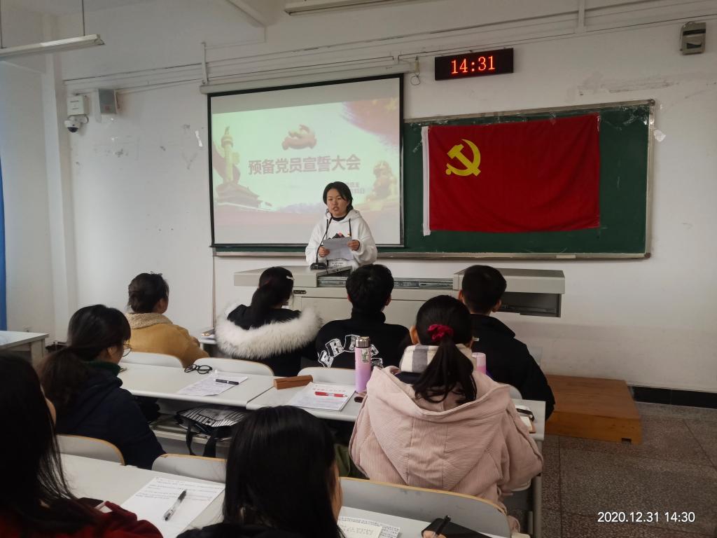 为了更好让预备党员接受党的教育,树立为共产主义奋斗终身的理想信念,2020年12月31日下午,我院在明辨楼1栋311召开了预备党员入党宣誓大会,会议由鲍寒冰同志主持,学生第一党支部书记王陈超、学生第二党支部书记张悦及14名预备党员参与本次会议。