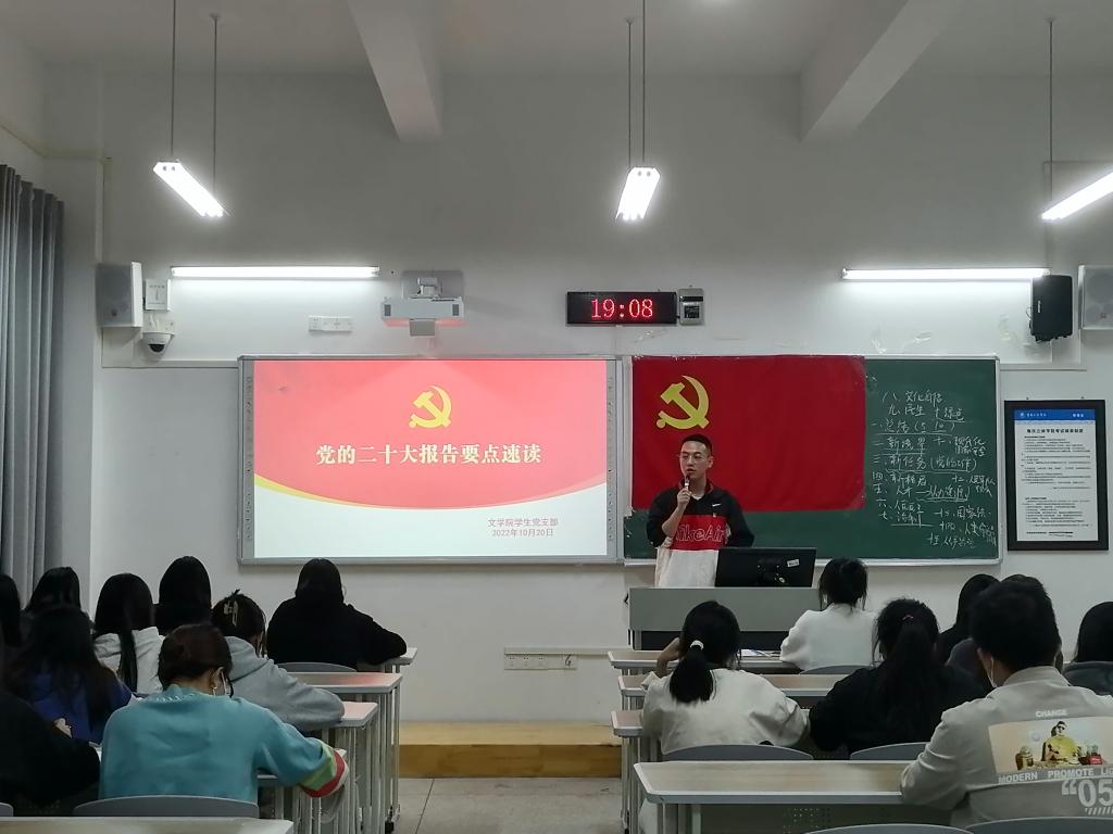为激发我院学生党员爱党、爱国热情,促进大学生对党的二十大报告的进一步理解,深入学习、全面贯彻党的二十大报告。bw必威西汉姆联官网学生党支部于2022年10月20日19点分别在博学楼1-111、1-112和1-113开展了“党的二十大报告要点速读”主题党日活动。本次活动由程艳同志、余周城同志和杨茹钠同志分别主持,bw必威西汉姆联官网在校学生党员、第13期发展对象以及第81期积极分子全体成员参与本次活动。