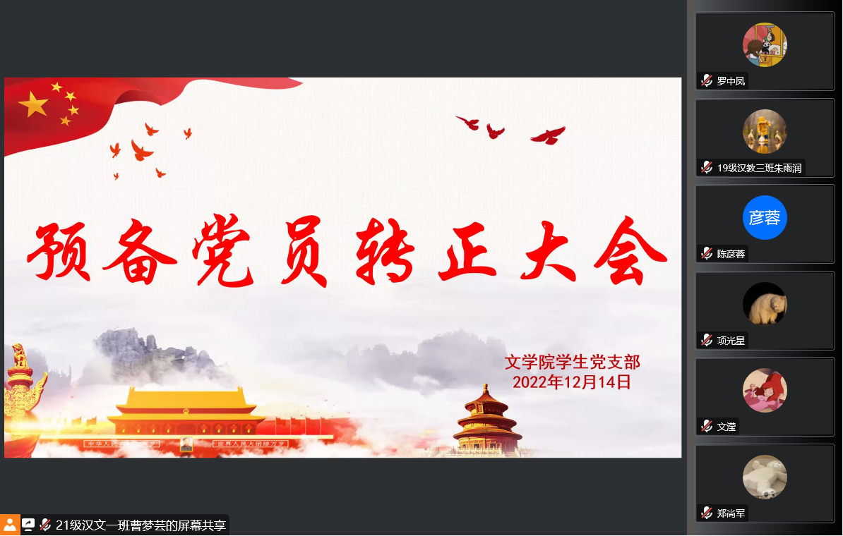 根据党支部发展党员工作计划,经党员和群众意见、支部委员会审查同意,我院党总支学生党支部于12月14日召开线上党员大会,讨论预备党员胡莉、杨礼仪等31名同志的转正问题。我院学生第一党支部书记张悦、学生第二党支部书记陈进、17名全体正式党员和31名预备党员参与此次会议。