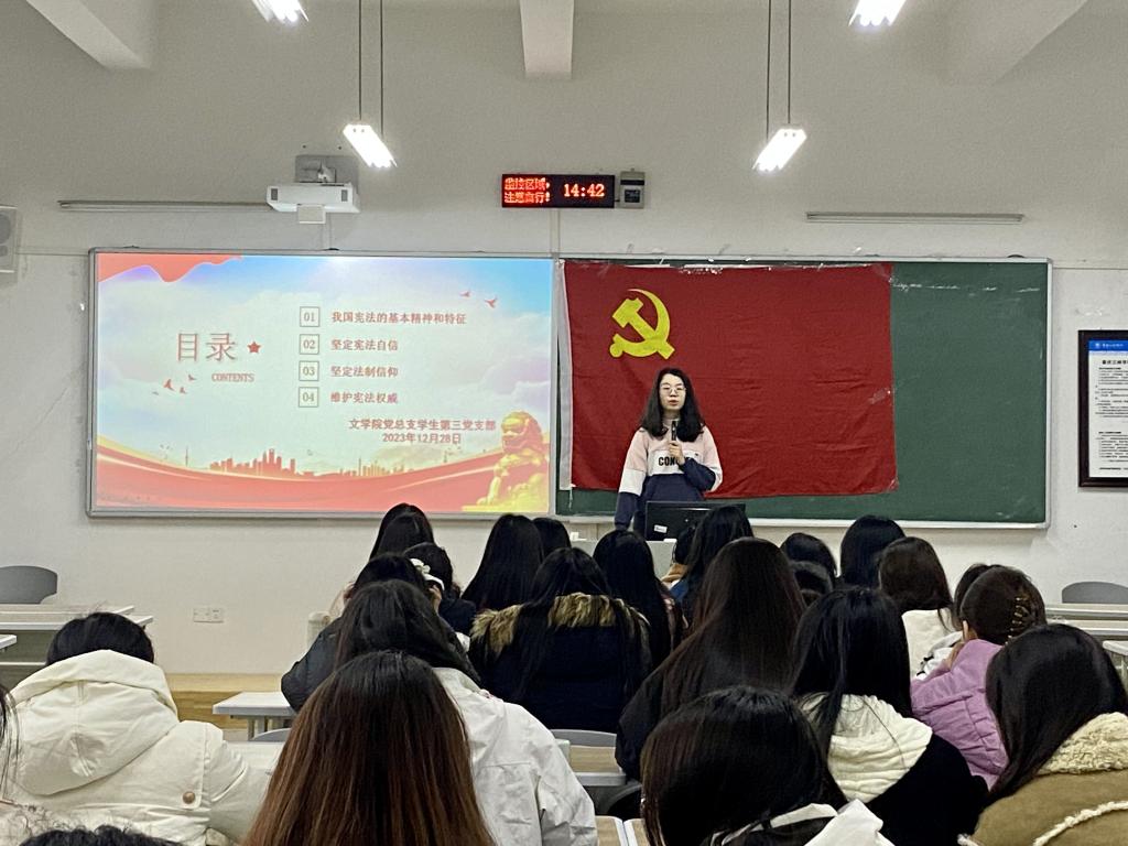 为进一步彰显中国特色社会主义的道路自信、理论自信、制度自信和文化自信,增强全社会的宪法意识,2023年12月28日,bw必威西汉姆联官网党总支学生第一、第二和第三党支部在博学楼2栋104室开展本月主题党日活动,党支部书记、正式党员和预备党员参加。