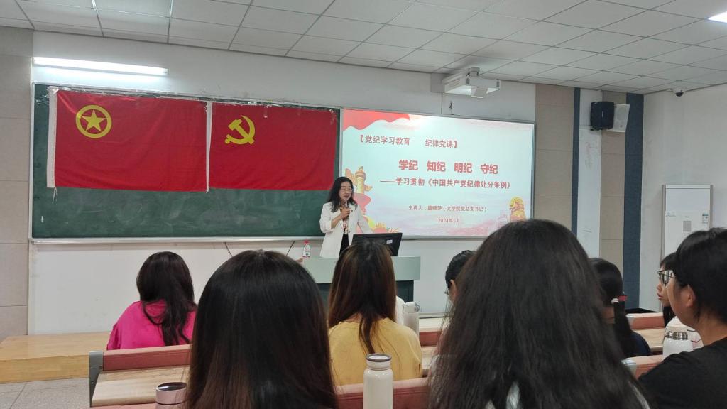 为贯彻落实领导干部联系班级活动,深入了解学生的思想动态和学习情况,5月21日上午,我院于博学楼1栋101开展了党总支书记联系班级活动。我院党总支书记唐晓萍以“学纪、知纪、明纪、守纪”为主题,以培育学生道德修养、增强纪律意识为重点,教育引导学生立足党纪,学习贯彻《中国共产党纪律处分条例》。2023级汉语言文学(师范)1班全体学生参与。