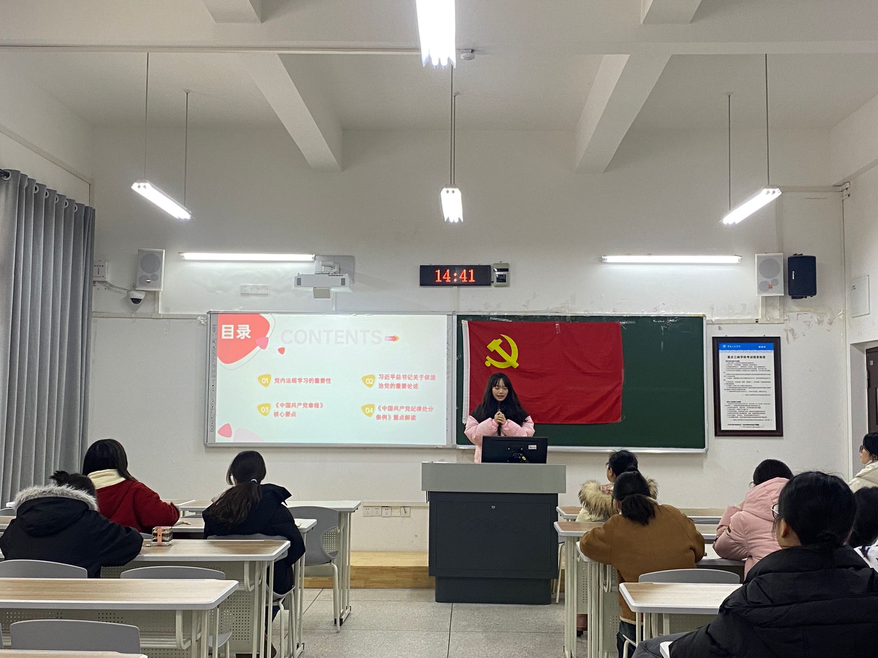 会上,党员代表唐佳佳同志和瞿园园同志进行领学。唐佳佳通过对宪法内容的深刻剖析以及对宪法的发展历程的阐述,强调了作为学生党员在遵纪守法中应该起到尊重宪法的模范作用,带头学习宪法、遵守宪法、运用宪法。瞿园园则首先提到了党内法规的重要性,再举例说明党员的先进事迹及其带给我们的思考。要求大家强化理论学习,提高政治觉悟,强化实践锻炼,转化学习成果。