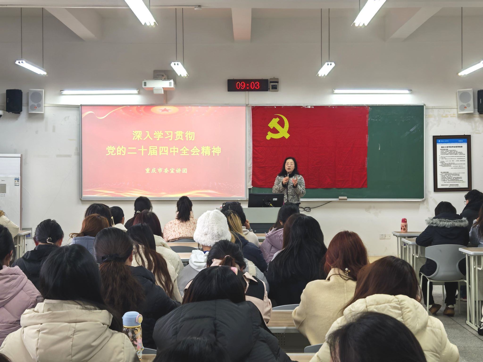 会上,唐晓萍紧扣全会核心精神,结合重庆实际落地举措展开系统宣讲。她从全会召开的时代背景切入,深入阐释了党的二十届四中全会在中国式现代化建设关键时期所具备的全局意义、历史分量与里程碑价值。